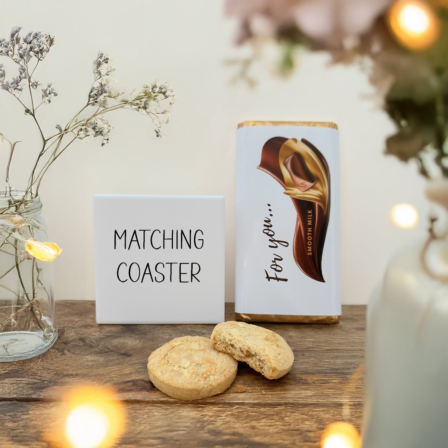 A touch of everyday luxury - a beautiful ceramic coaster in smooth matt, 100g Galaxy chocolate dressed in your chosen label, and crumbly butter biscuit bliss to complete the moment.